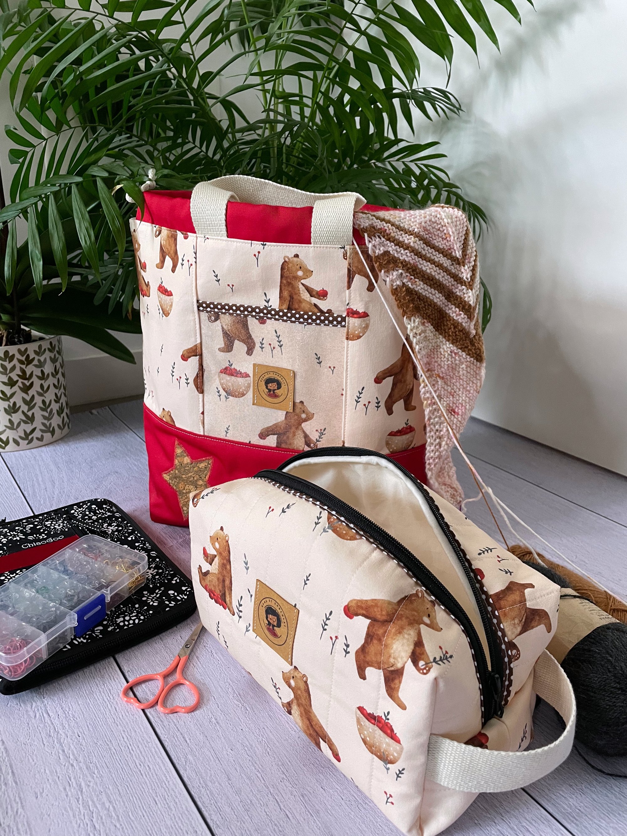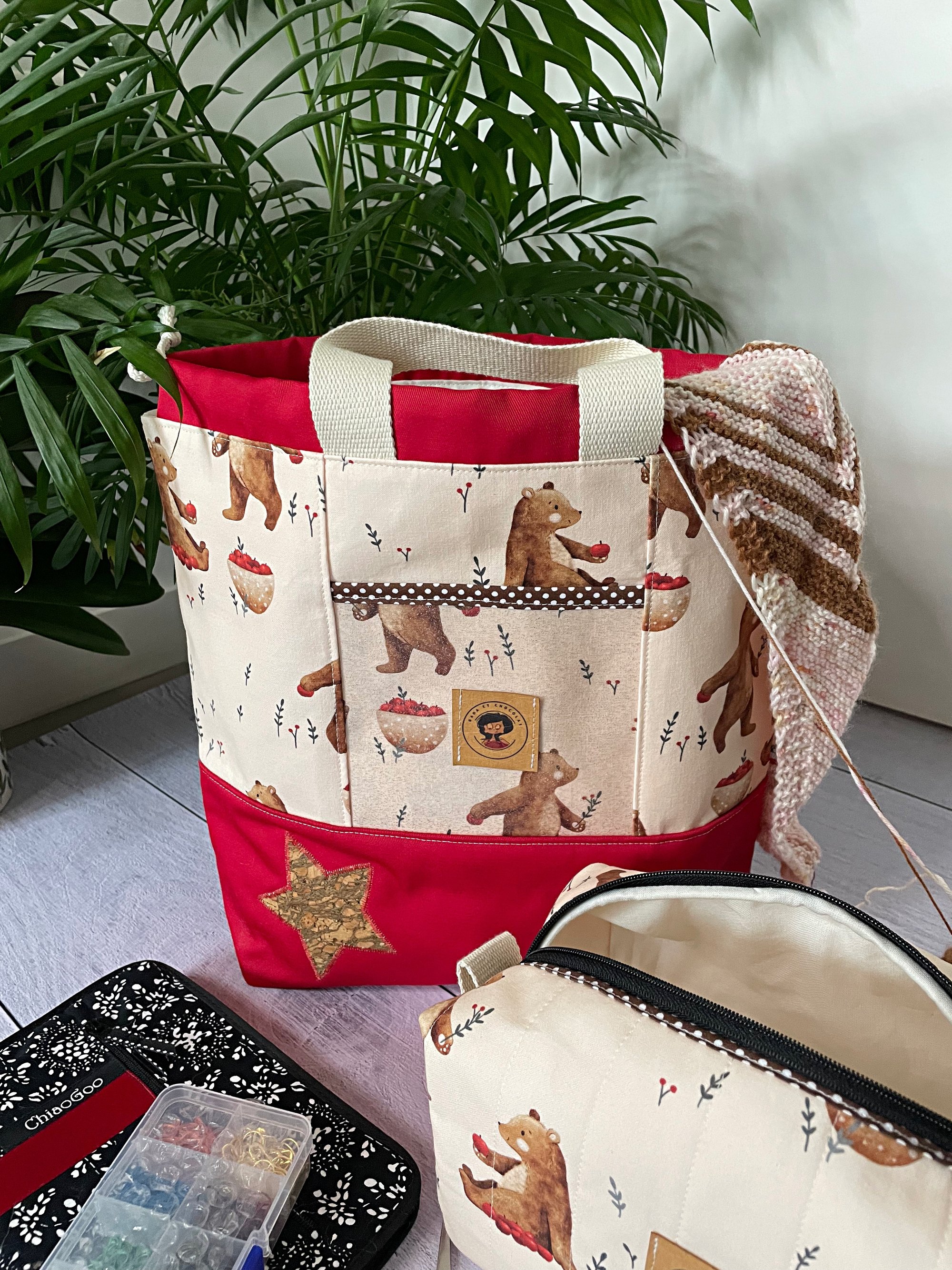 Sac à projet en coton, pouvant contenir vos ouvrages en tricot, crochet, couture et broderie. Cousu à la main avec amour en Charente Maritime.