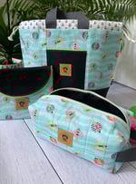 Tissus utilisés: Tissus en coton de belle qualité, ouatine ( pour matelasser la trousse) et entoilage pour donner de la tenue à la trousse.