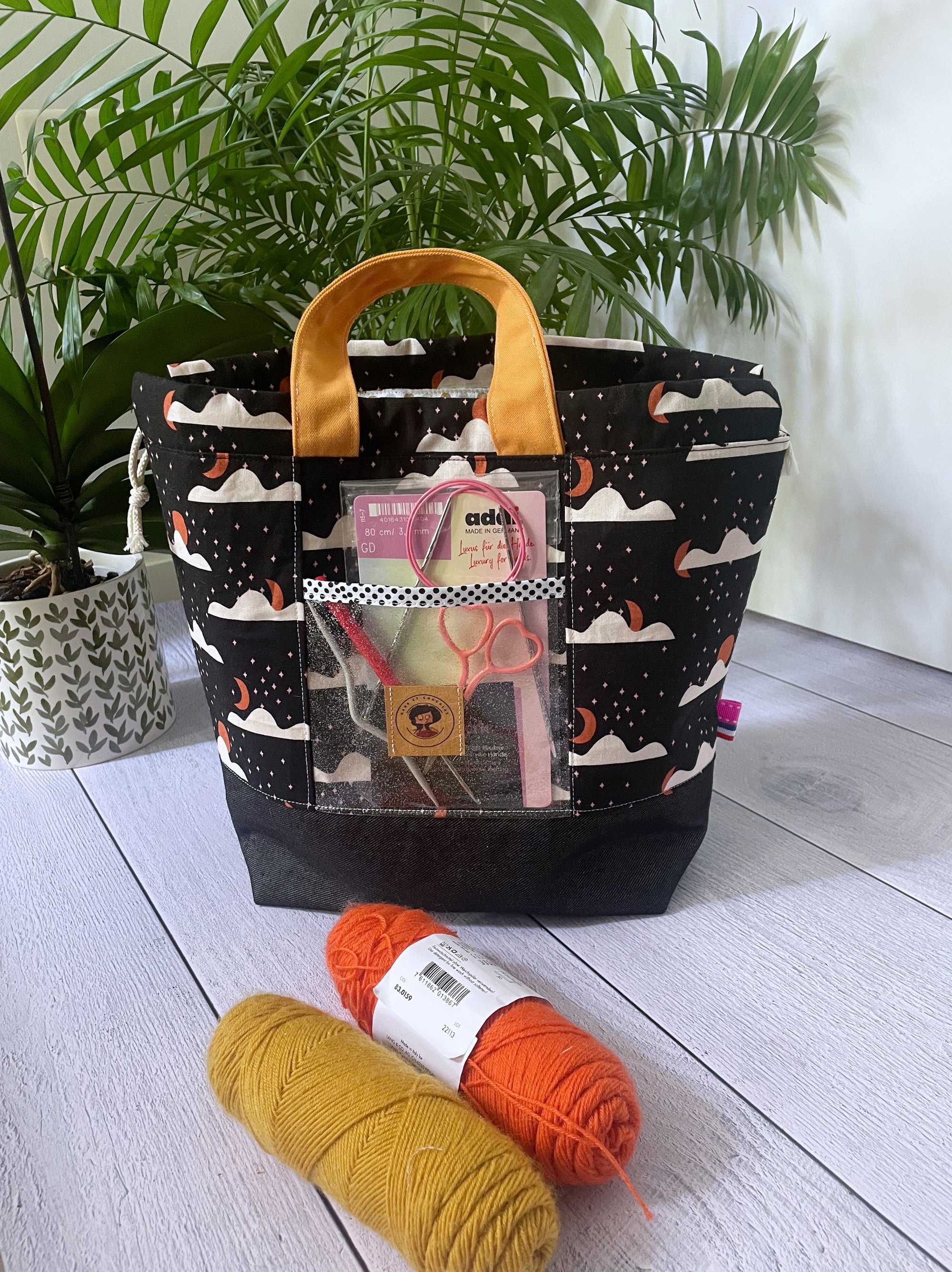 Ce sac est parfait pour transporter vos ouvrages partout. Il peut contenir un projet de taille moyenne, grand châle, petit top, ainsi que 3 à 4 écheveaux .